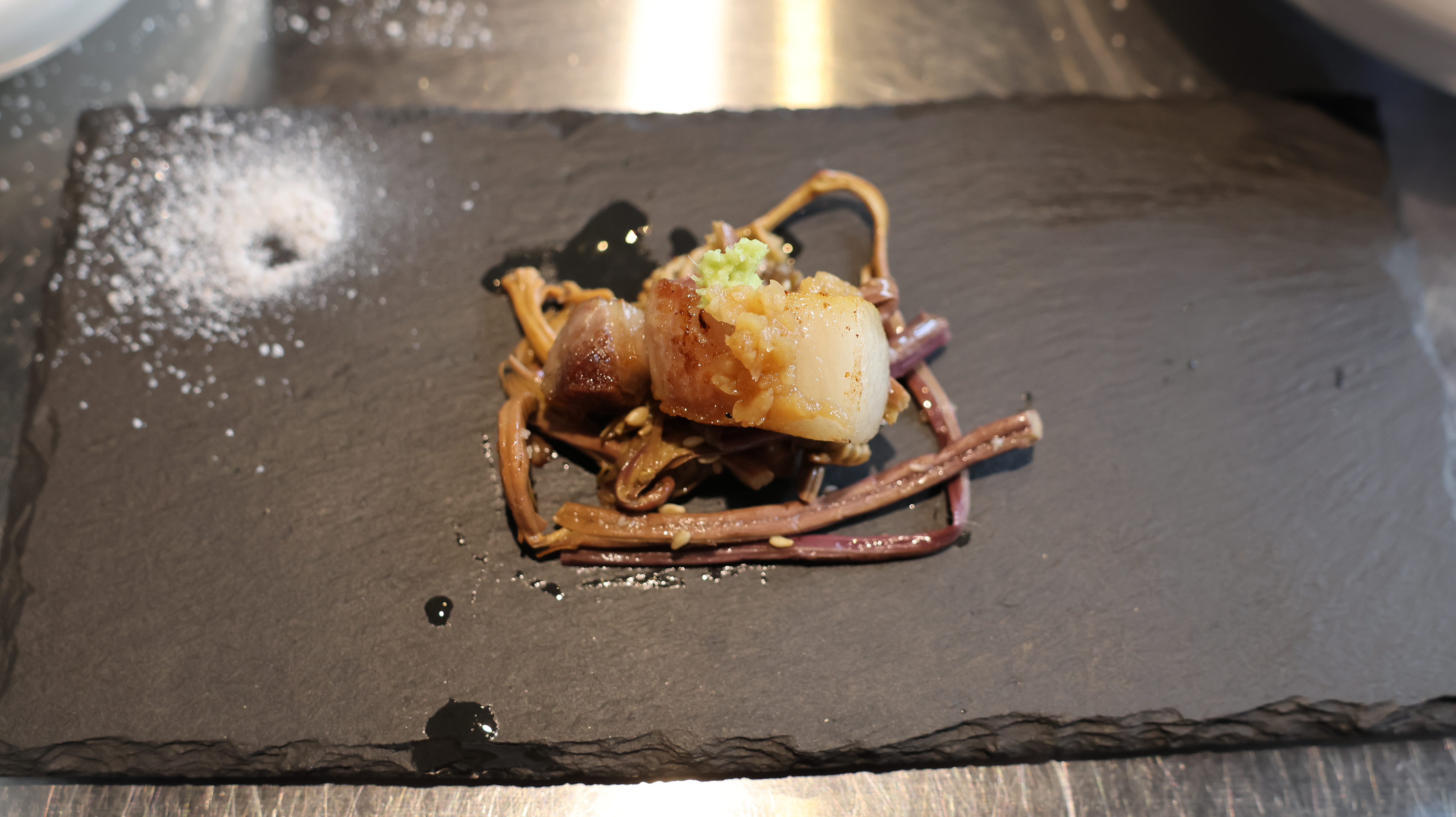 특수부위들도 정말 인상적이었어요. 관자살, 턱밑살, 꼬들살, 항정살 등 평소에 쉽게 먹기 힘든 부위들이 한 판에 나오니까, 각각의 식감과 풍미를 비교해가며 먹는 재미가 있었습니다. 특히 항정살은 씹을 때마다 고소한 기름이 터지면서도 느끼하지 않고, 갓김치랑 와사비를 올려 먹으니 고기의 풍미가 한층 더 살아났습니다.